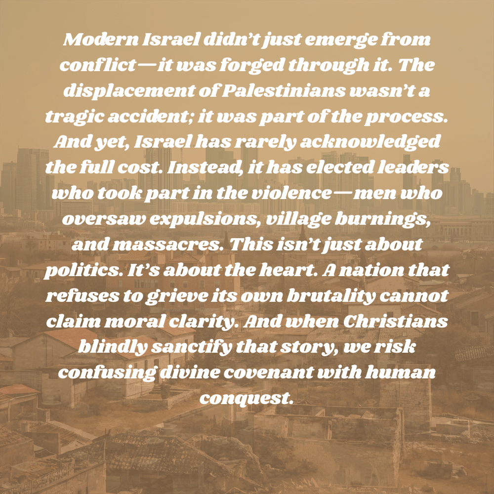 The human cost of this conflict has included displacement, terror, and sexual violence against Palestinian women. These realities are often overlooked in Christian circles. When theology becomes entangled with political power, the suffering of “the other” is too easily dismissed as nothing more than “birth pangs of the Kingdom.”